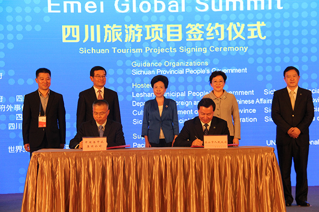 在簽約儀式上,港中投總經(jīng)理許慕韓與樂山市張彤市長(zhǎng)簽訂了「關(guān)於合作開發(fā)樂山市、峨眉山市旅遊資源的戰(zhàn)略合作協(xié)定」。姜巖總經(jīng)理與四川省黃彥蓉副省長(zhǎng)、省旅遊局郝康理局長(zhǎng)和樂山市委唐堅(jiān)書記作為證簽人見證了雙方協(xié)議的簽署。