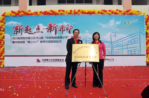 2010年10月11日上午,位于四川省資陽市雁江區(qū)丹山鎮(zhèn)牌坊村的中國免稅希望小學(xué)里喜氣洋洋、熱鬧非凡。特意從北京趕來的中國青少年發(fā)展基金會(huì)的汪敏副秘書長、馮敏慧部長,中免集團(tuán)盧路總裁和四川省市兩地的領(lǐng)導(dǎo)與全校近兩百名師生一起為新落成的“資陽市雁江區(qū)丹山鎮(zhèn)中國免稅希望小學(xué)”舉行了隆重的落成典禮。