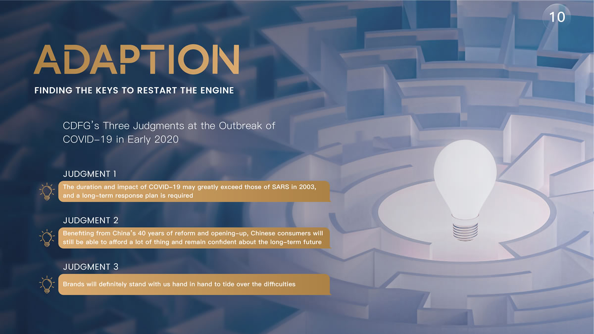 陳國強指出:"在三年前疫情剛剛爆發(fā)時,我做出了3個判斷:一是這場疫情的持續(xù)時間可能會大大超過2003年的非典,我們必須做出長期的應對規(guī)劃;二是雖然疫情會帶來各方面的不利影響,但在中國40年改革開放的紅利下,消費者仍保持著強勁的消費能力并對未來長期充滿信心;三是品牌方一定會和我們站在一起,共謀方略,共渡難關。"