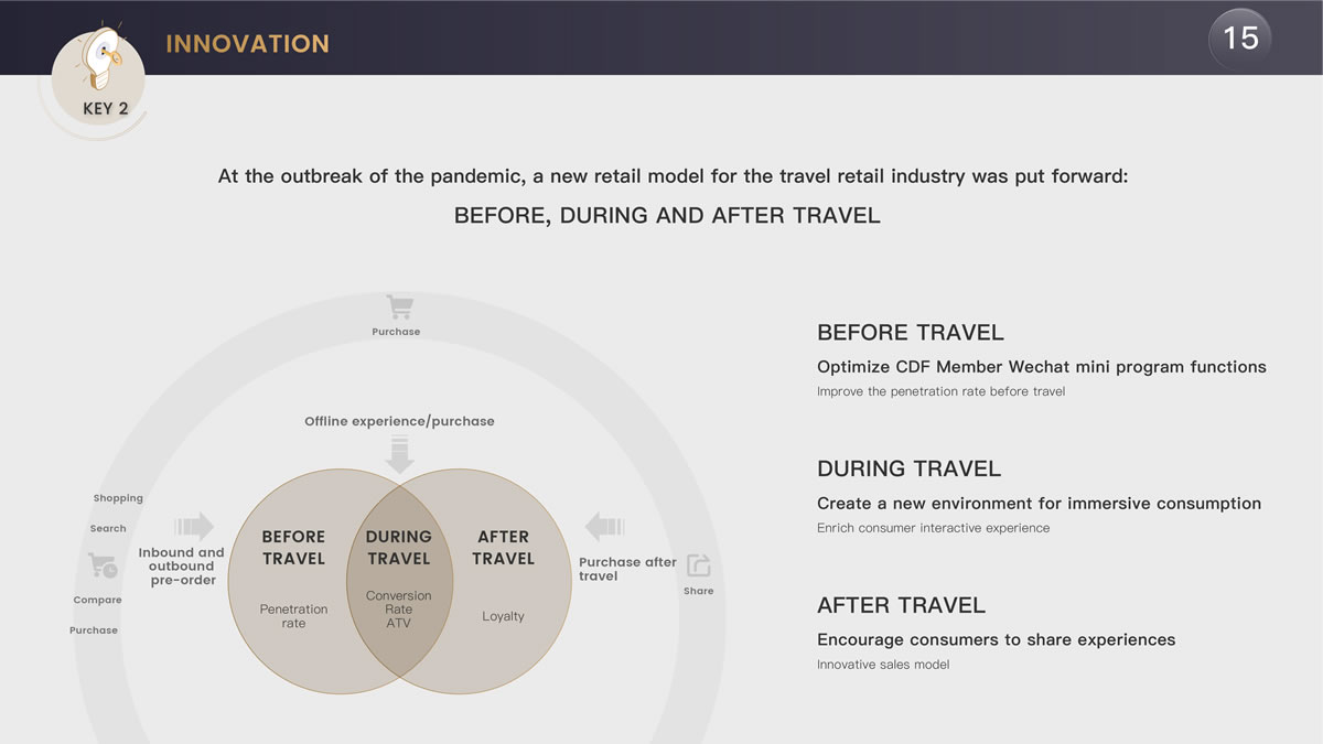 在創(chuàng)新發(fā)展方面,中免集團主要開展了三大方面的探索,包括完善了基于行前、行中、行后的旅游新零售模式,針對中國最有消費能力客群推出超級VIP服務,以及將充滿科技感和體驗感的元素融入線上線下消費場景。