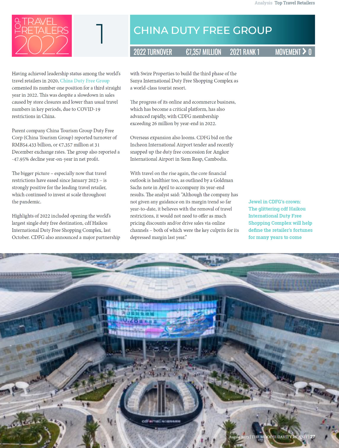 2023年8月28日,全球旅游零售行業(yè)權(quán)威媒體《穆迪達(dá)維特免稅報(bào)告》(The Moodie Davitt Report)發(fā)布《全球領(lǐng)先旅游零售商報(bào)告》,對(duì)過去一年來全球前20名旅游零售商展開了跟蹤評(píng)估。報(bào)告顯示,根據(jù)2022年?duì)I業(yè)額統(tǒng)計(jì),中免集團(tuán)連續(xù)第三年在全球頂級(jí)旅游零售商中保持領(lǐng)先地位,成為2022年全球最大旅游零售商。