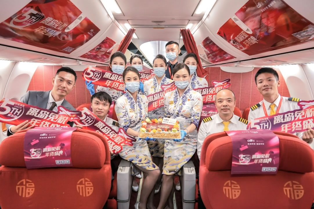 中免集團(tuán)聯(lián)動(dòng)航空資源推出主題航班活動(dòng),帶來了沉浸式的新鮮有趣互動(dòng)體驗(yàn)。11月15日,cdf??趪?guó)際免稅城聯(lián)合cdf??谌赵聫V場(chǎng)免稅店、cdf??诿捞m機(jī)場(chǎng)免稅店,聯(lián)動(dòng)海南航空,于HU7782北京-海口航班上開展主題航班活動(dòng),通過營(yíng)造節(jié)慶氛圍,開展互動(dòng)問答等趣味活動(dòng),與機(jī)上旅客積極互動(dòng),并予以乘坐該航班旅客相應(yīng)購物權(quán)益。cdf三亞國(guó)際免稅城也在HO1747南京—三亞的吉祥航空主題航班上為乘客精心準(zhǔn)備了主題蛋糕及消費(fèi)權(quán)益,在豐富乘機(jī)體驗(yàn)的同時(shí),更增強(qiáng)旅客對(duì)于免稅及活動(dòng)的了解。