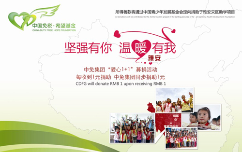 在四川雅安地震發(fā)生后,中免集團與中國青少年發(fā)展基金會(以下簡稱“青基會”)緊急協(xié)商籌備,決定通過“中國免稅希望基金”,在中免集團全體員工、各下屬門店以及門店消費者中發(fā)起主題為“愛心1+1”的募捐活動。 “愛心1+1”即中免集團將對消費者所捐善款按1:1進行配比,最終通過青基會用于雅安震后教育設施恢復和兒童復學項目,同時中免集團也將通過官網(wǎng)與官方微博第一時間公布善款使用情況,所有捐款接受專項審計?;顒訉⒊掷m(xù)至5月20日,在此期間,公眾可在中免集團三亞免稅店以及各邊境、機場免稅店參與本次愛心捐助活動。