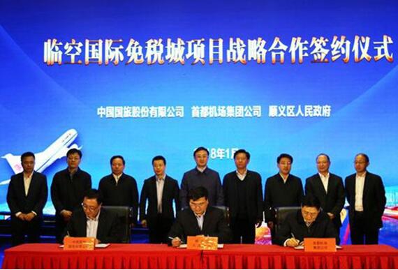 1月12日,中國(guó)國(guó)旅股份有限公司、首都機(jī)場(chǎng)集團(tuán)、順義區(qū)三方在京舉行臨空國(guó)際免稅城項(xiàng)目戰(zhàn)略合作框架協(xié)議簽約儀式。中國(guó)旅游集團(tuán)副總經(jīng)理、國(guó)旅股份公司董事長(zhǎng)李剛,首都機(jī)場(chǎng)集團(tuán)公司總經(jīng)理、黨委副書記劉雪松,北京市順義區(qū)委書記王剛出席簽約儀式,國(guó)旅股份公司總經(jīng)理彭輝、首都機(jī)場(chǎng)集團(tuán)黨委書記、副總經(jīng)理宋勝利與順義區(qū)區(qū)委常委、副區(qū)長(zhǎng)初軍威代表三方在協(xié)議上簽字。