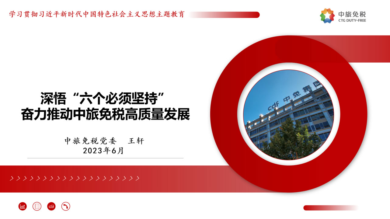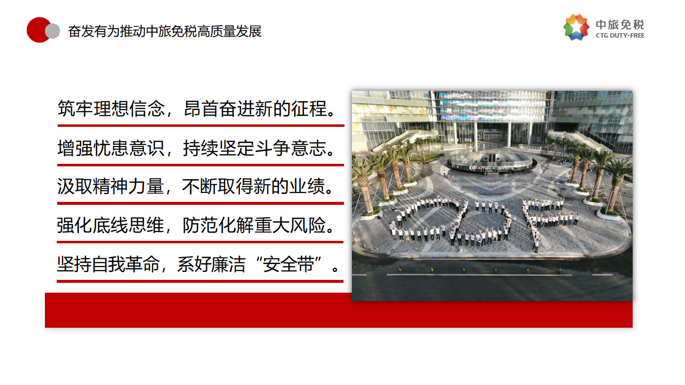 一是筑牢理想信念,昂首奮進新的征程。要堅決貫徹落實總書記指示,優(yōu)化發(fā)展方式,注重發(fā)展品質(zhì),追求質(zhì)量更優(yōu)、效益更好、效率更高的可持續(xù)增長,做強做優(yōu)公司核心競爭優(yōu)勢,全面提升公司經(jīng)營發(fā)展的系統(tǒng)能力。二是增強憂患意識,持續(xù)堅定斗爭意志。要進一步強化危機意識、憂患意識,主動擔責(zé)、主動擔難、主動擔險,以強烈的使命感和責(zé)任感,統(tǒng)一思想、統(tǒng)一意志、統(tǒng)一行動。三是汲取精神力量,不斷取得新的業(yè)績。要以“紅色引擎 免稅先鋒”“海棠精神”“紅帆工程”等黨建品牌活動為切入點,進一步提升基層黨組織的組織力,通過共建活動平臺、分享工作資源、交流工作經(jīng)驗、解決實際問題等途徑,實現(xiàn)黨的建設(shè)與業(yè)務(wù)發(fā)展建設(shè)良性互動,以深入推進全面從嚴治黨引領(lǐng)保障高質(zhì)量發(fā)展。四是強化底線思維,防范化解重大風(fēng)險。要深刻領(lǐng)會習(xí)近平總書記關(guān)于強化底線思維,防范化解重大風(fēng)險的重要論述,充分認清當前面臨的形勢任務(wù),系統(tǒng)梳理查找存在的突出風(fēng)險問題,自覺從習(xí)近平新時代中國特色社會主義思想中找到破解矛盾問題的鑰匙,努力在新思想指引下探索推動高質(zhì)量發(fā)展的路徑。五是堅持自我革命,系好廉潔的“安全帶”。要繼續(xù)發(fā)揚自我革命精神,縱深推進黨風(fēng)廉政建設(shè)和反腐敗斗爭,一體推進“不敢腐、不能腐、不想腐”,圍繞財經(jīng)領(lǐng)域?qū)m椪蔚戎攸c問題、緊盯海南地區(qū)所屬的重點企業(yè)和重點項目,以及防范離島免稅“套代購”、傳統(tǒng)渠道免稅店經(jīng)營風(fēng)險等重點領(lǐng)域和巡視整改等重點工作,深化標本兼治、系統(tǒng)治理,以新時代廉潔文化建設(shè),涵養(yǎng)求真務(wù)實、團結(jié)奮斗的中免風(fēng)貌。