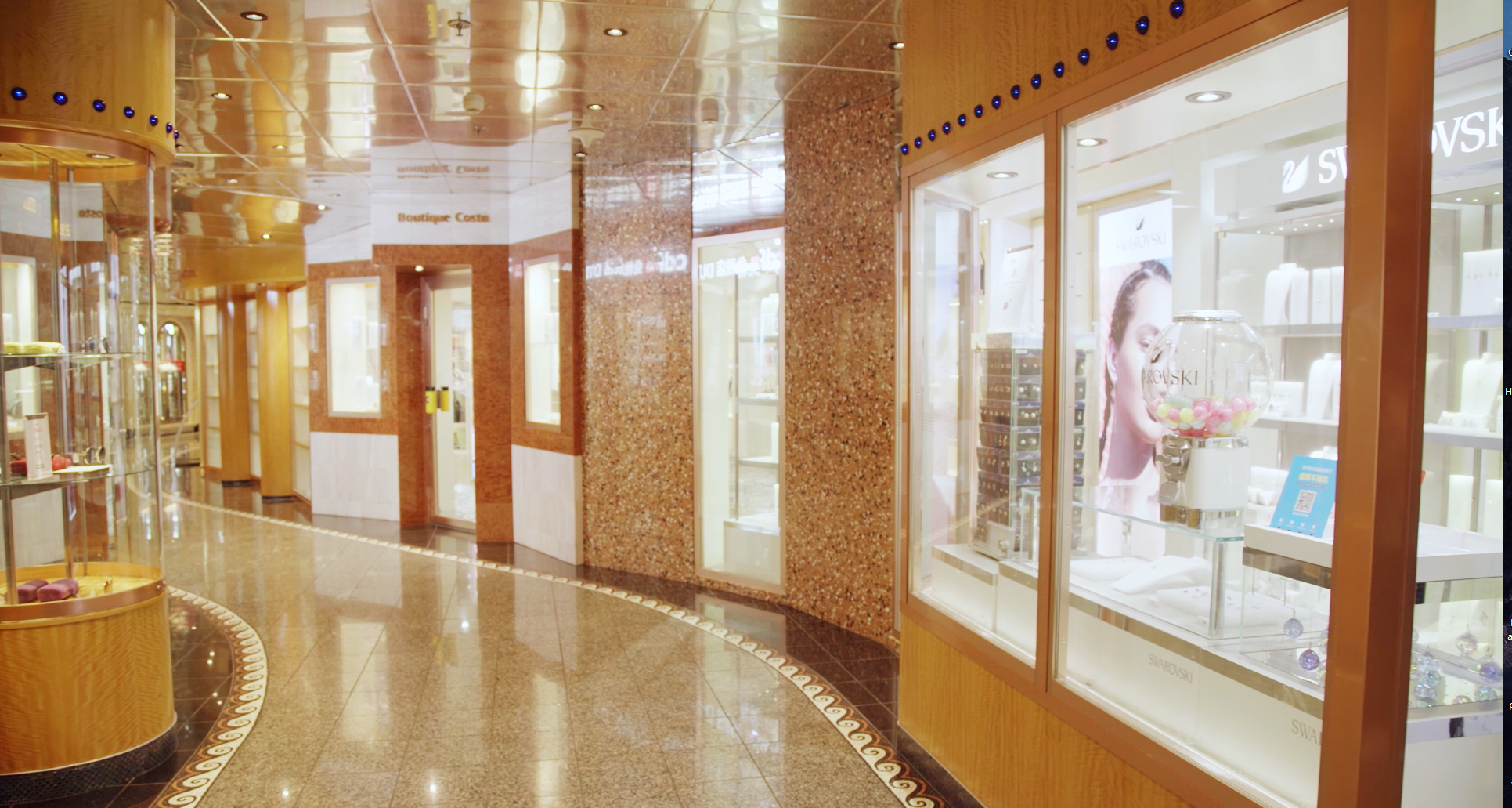 大西洋號(hào)郵輪免稅店位于歌詩(shī)達(dá)大西洋號(hào)3層,由香水化妝品區(qū)、精品配飾區(qū)、煙草酒水區(qū)、食品特產(chǎn)區(qū)及專賣店組成,面積逾400平方米。免稅店專注于打造全方位的免稅購(gòu)物環(huán)境,通過(guò)正品保證和貼心服務(wù),務(wù)求無(wú)論顧客在通往何處的旅程,都能享有同樣精彩、奢華的購(gòu)物體驗(yàn)。