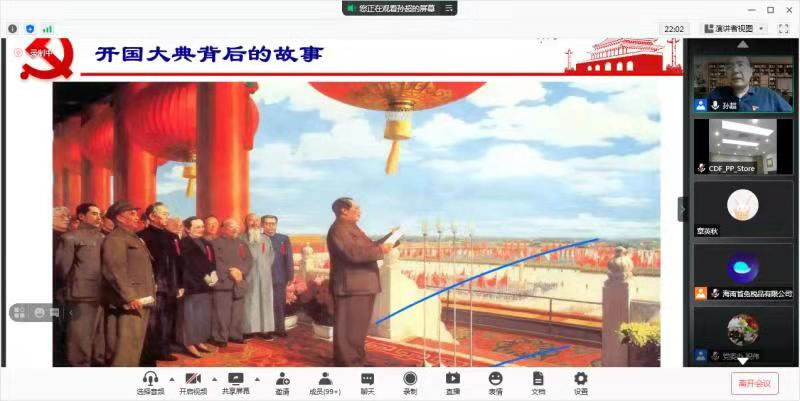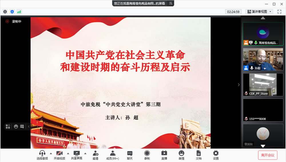 2021年5月27日,中旅免稅黨委舉辦第三期“黨史大講堂”專題培訓(xùn)。根據(jù)中旅免稅黨委“黨史大講堂”培訓(xùn)工作安排,此次活動由海南省免稅品有限公司黨委組織承辦,海南省免稅品有限公司黨委班子成員和機關(guān)黨支部全體黨員在會議室集中參加線上培訓(xùn),中旅免稅其他各級黨組織黨員和入黨積極分子共600余人通過視頻方式線上參會。