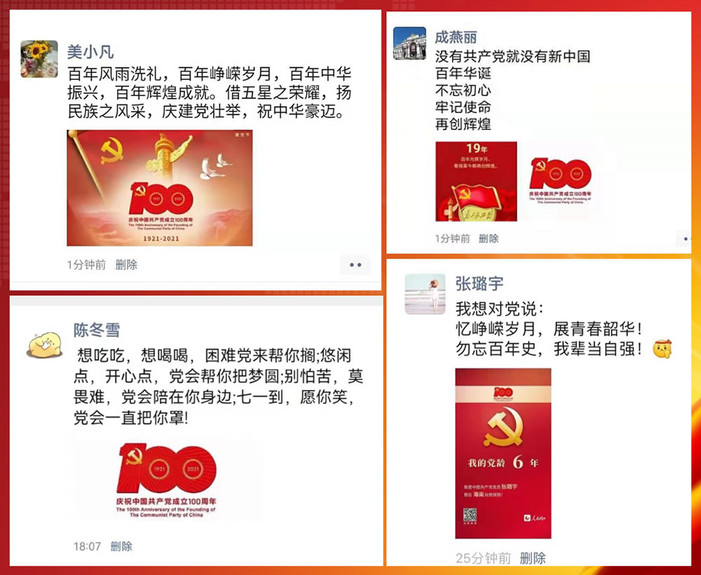 奮斗百年路,啟航新征程。為慶祝黨的百年華誕,激發(fā)黨員群眾愛黨愛國(guó)熱情,近日來,公司各級(jí)黨組織、團(tuán)組織積極組織黨員和團(tuán)員青年開展了形式多樣的主題活動(dòng),表達(dá)對(duì)中國(guó)共產(chǎn)黨的無限熱愛和對(duì)祖國(guó)的美好祝福!